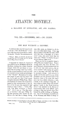 SPOILER ALERT: It was many years after I first read it that I learned that The Man Without A Country is not a true story at all. It was a newly-minted (in 1863) allegory about patriotism and The Civil War, which was currently ripping the country apart.
