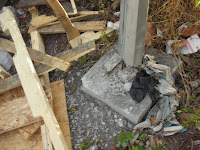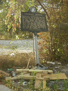 I have since visited Charles Avenue on four subsequent occasions. Only once was there no trash piled at the bottom of the historical marker. But, as you can see, it wouldn’t have mattered. The base is broken and the sign leans at an uncomfortable angle against a wire fence surrounding an empty lot of gravel and weeds.