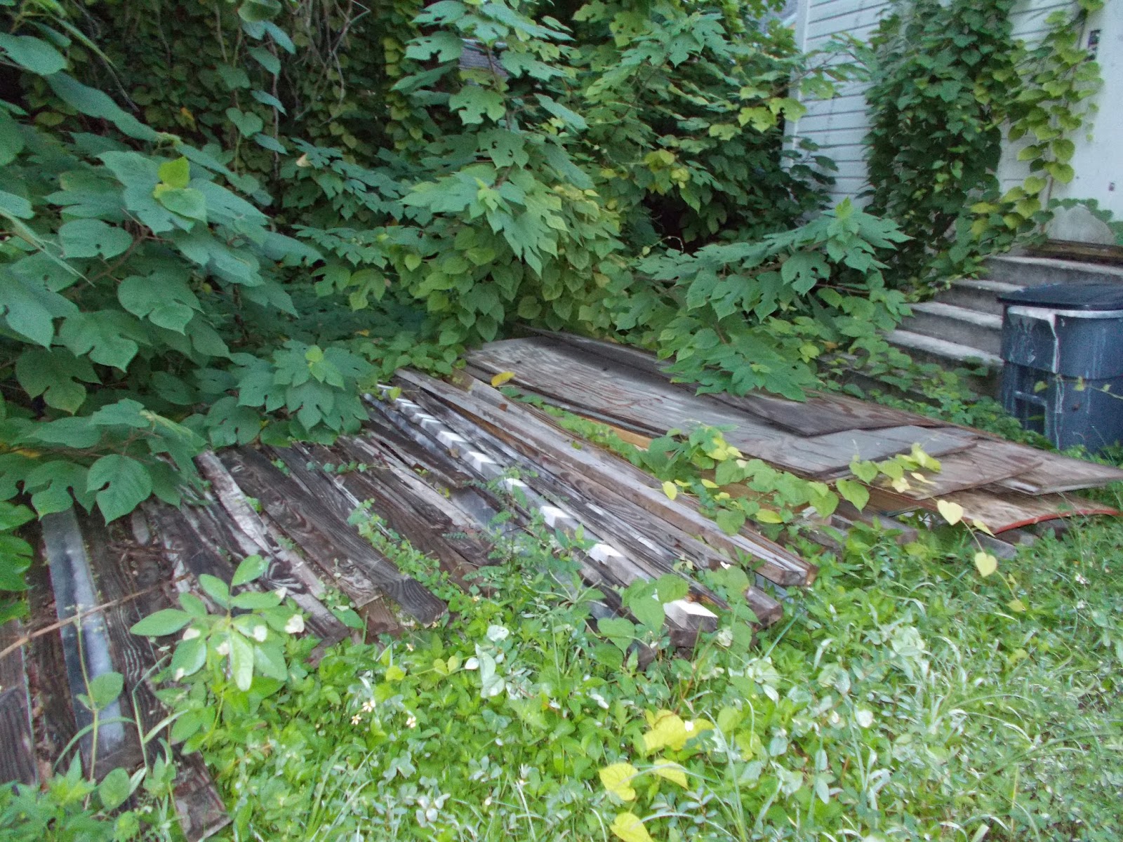 That jungle was cut back drastically in February for the first time in the 4 years I have been visiting the property. However, that had nothing to do with being cited by the city. It was in advance of a meeting of the Charles Avenue Historic Committee, on which Gino Falsetto sits. He wanted to be able to point to SOME WORK having taken place, in case people asked. However, what was done actually destroyed part of the house, as documented here.