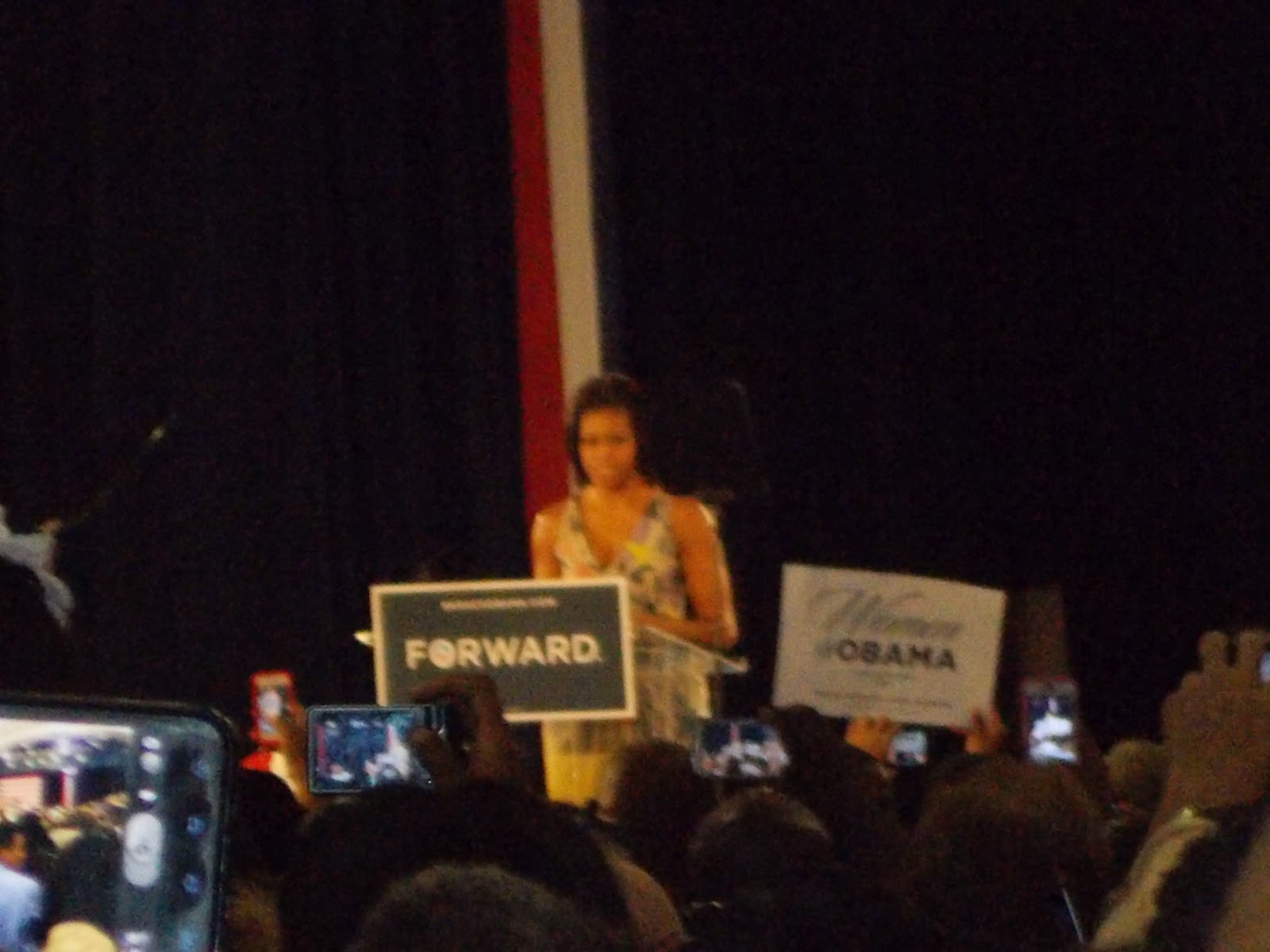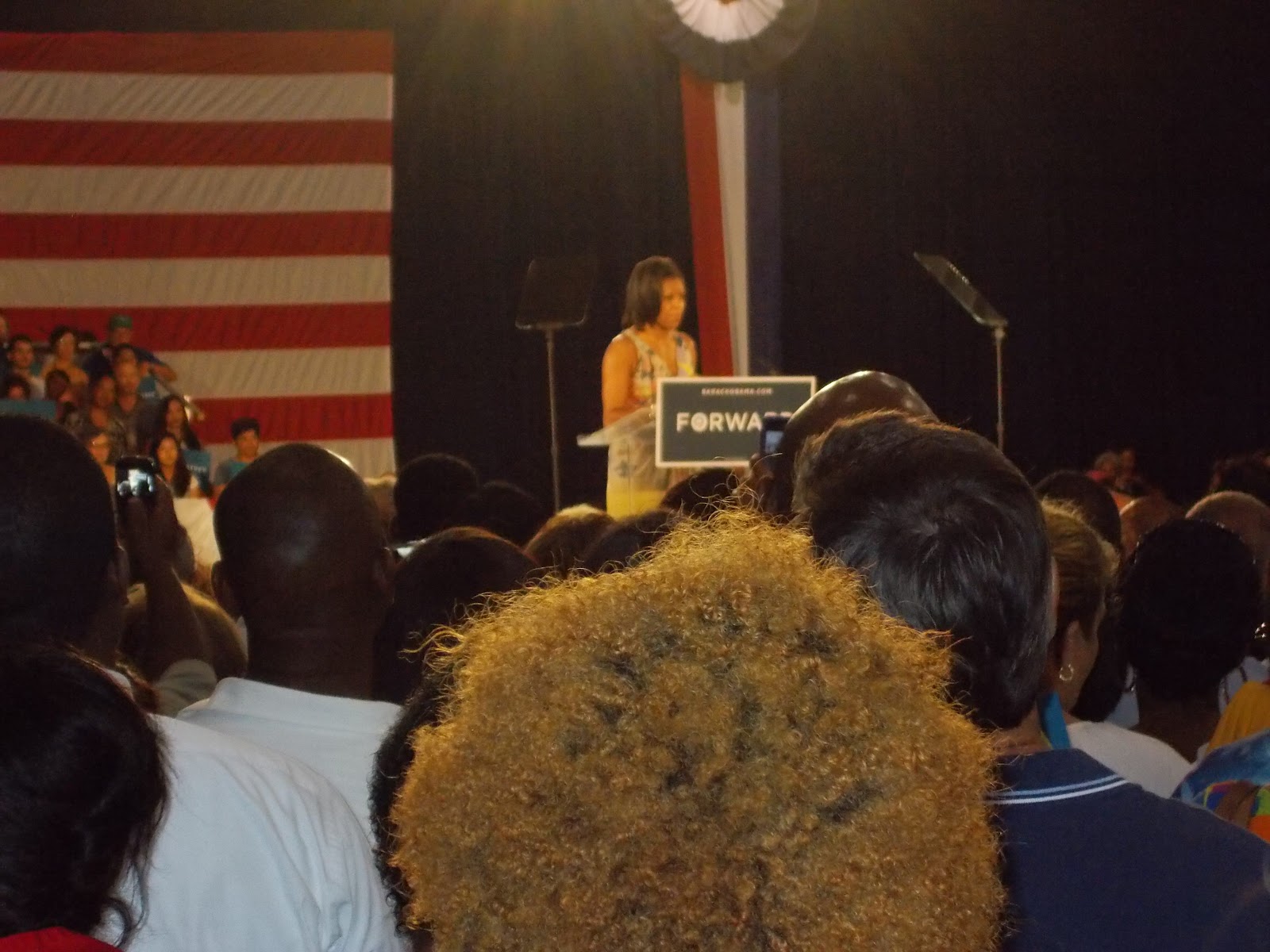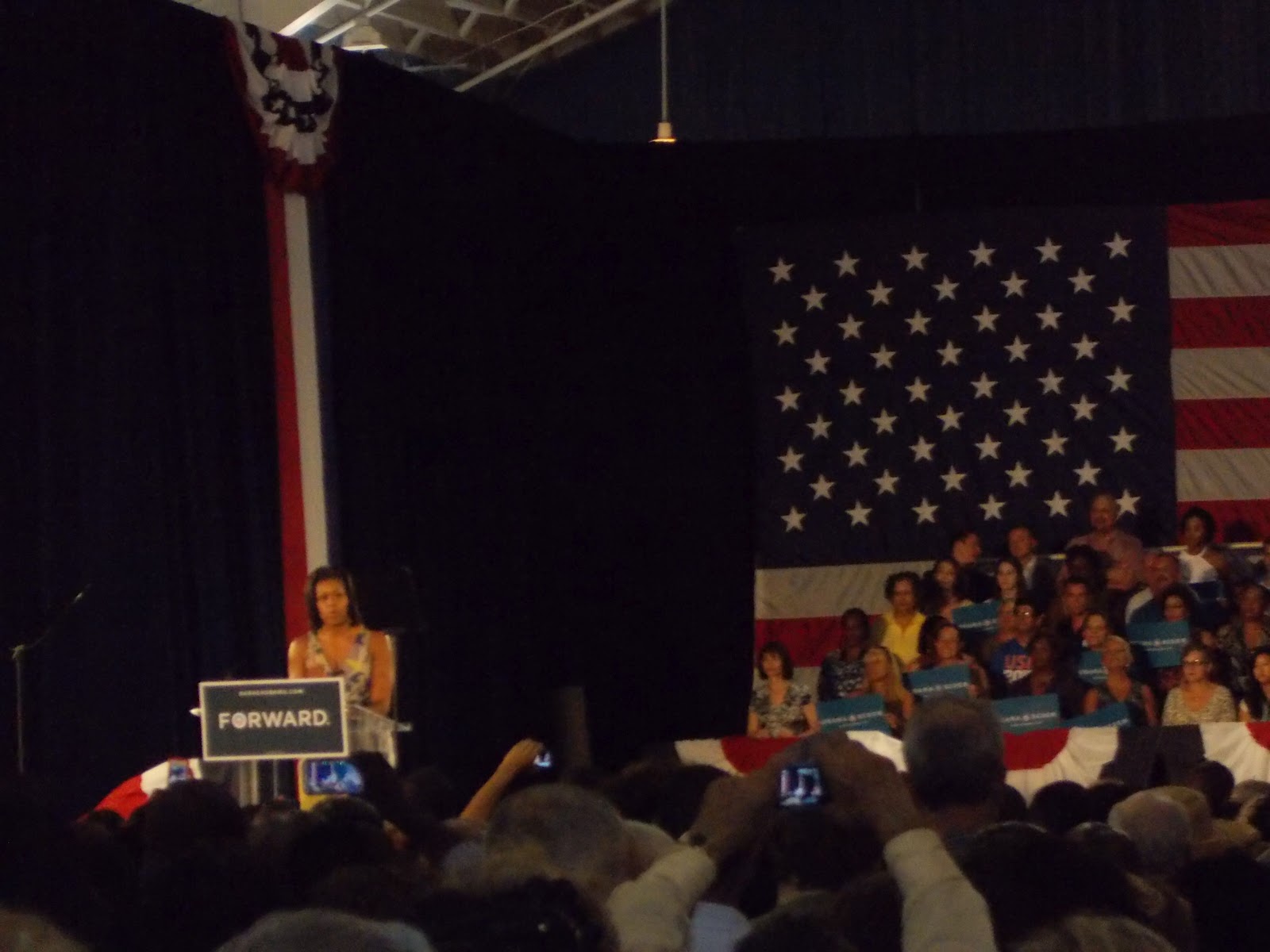 The First Lady must have been delayed at the last minute because I have never seen an intermission after the introductory speeches have already begun. These speeches are supposed to get the crowd revved up for the Main Act. However, they announced from the stage that there would be a 40 minute intermission before the First Lady would come out. That allowed the crowd to both mingle and push closer to the stage. Since it was starting to get a little tight where I was standing I decided to move back, which is why some of my pictures of The First Lady are less clear.