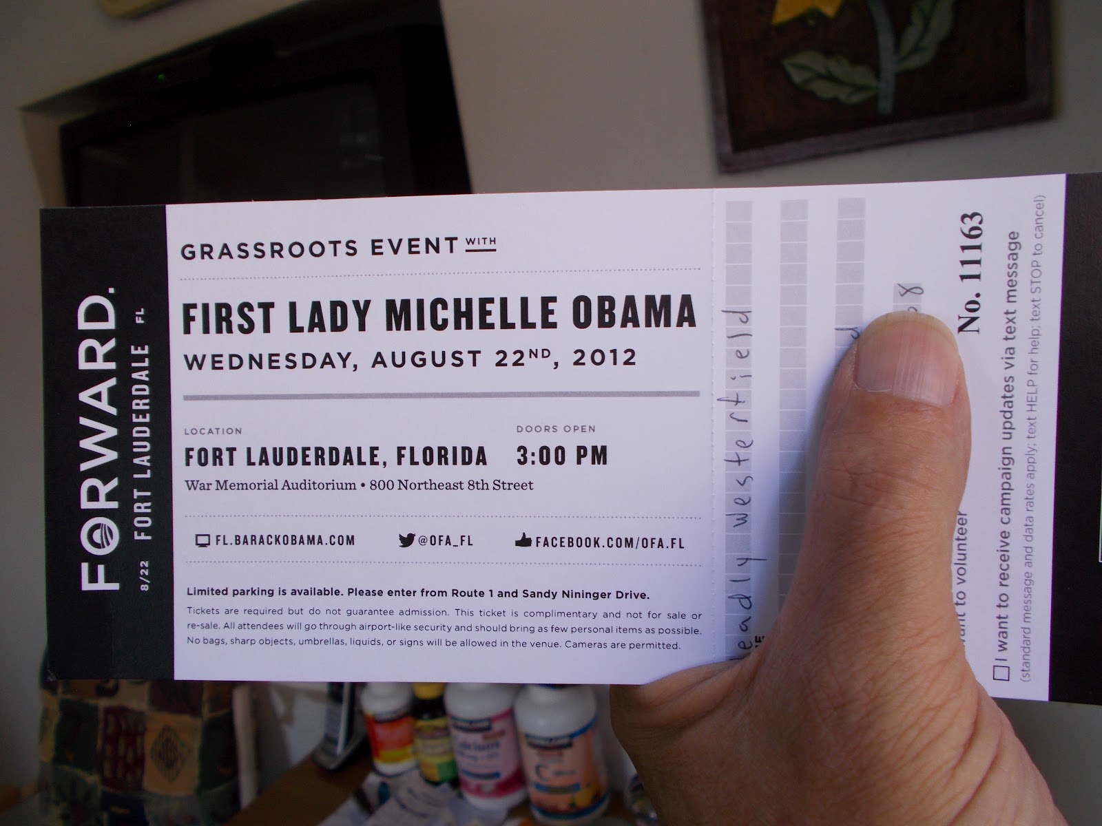 The Michelle Obama rally was taking place at Fort Lauderdale’s War Memorial Auditorium, just off Florida’s famous US Route 1 near Sunrise Blvd. In the seven years I’ve lived down here, I’ve not been to War Memorial Auditorum, known as War Memorial to the cognoscenti. Oddly enough, I have been to the Parker Playhouse just catercorner from it. I saw documentarian Ken Burns at the Parker (as the cognoscenti call it), when he brought a preview of his amazing documentary “Prohibition,” and afterwards took questions about his body of work. But never the War Memorial. And, because I approached Parker Playhouse from behind, I didn’t even know War Memorial was there. They hold a lot of different kinds of events at War Memorial Auditorium, as this sign I saw on the way there will testify.
