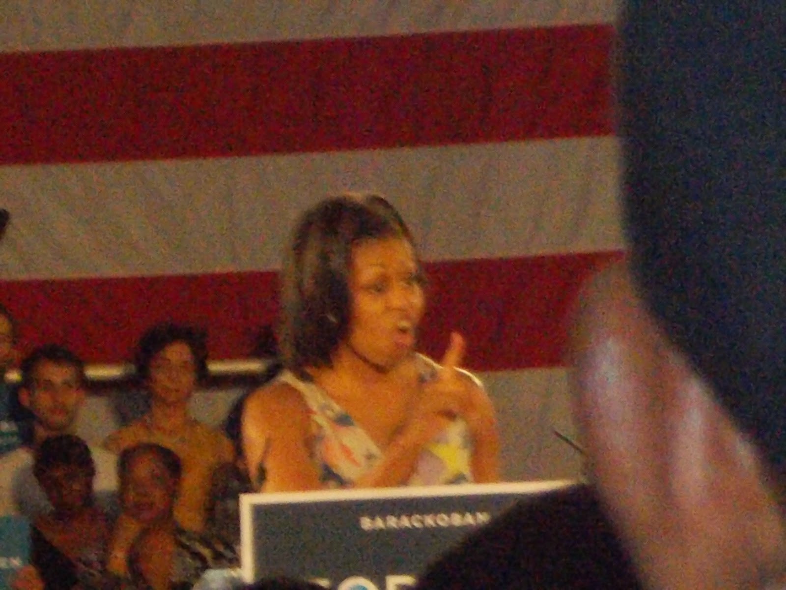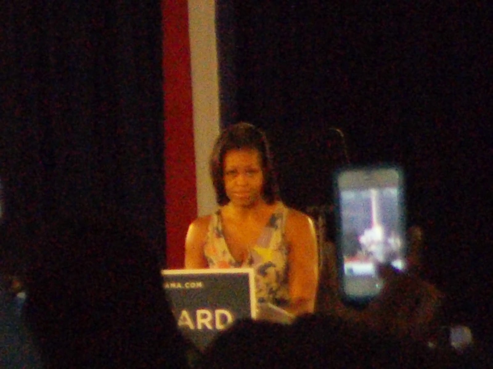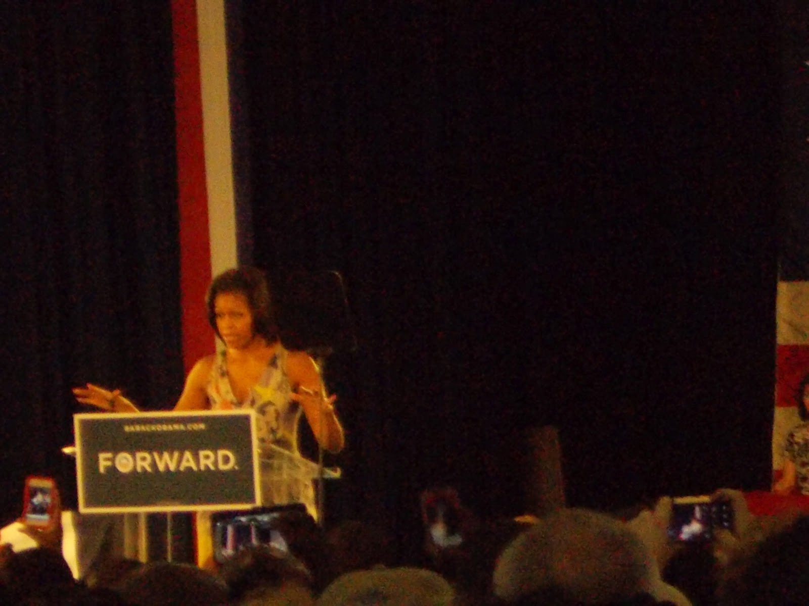 While we waited in line volunteers kept working the crowd, making sure everybody was registered to vote and to see who wanted to volunteer to help President Obama win the election. There was another group of volunteers who worked the crowd to alert us that we couldn’t bring in umbrellas, which many in the crowd carried to protect themselves from the oppressive sun, or cameras. This instruction puzzled a lot of people, who were all carrying cameras, and it had to be explained over and over again. The first explanation was that phone cameras were okay, but no other cameras. That also puzzled a lot of people, like myself, who were carrying stand-alone cameras. “Why are phone cameras allowed, but not other cameras?!?!” People were getting hot, and it wasn’t entirely from the heat. A lot of people had cameras and it’s only natural to want to document the day you saw the First Lady of the United States. It’s something you’ll want to show your children and grandchildren, provided the Mayans are wrong. Then it was clarified that small cameras, like mine, were allowed by not “big cameras.” However, the volunteers were unable to define “big camera” to anyone’s satisfaction. I presume they meant a 35mm camera with a telephoto lens, but who knows.