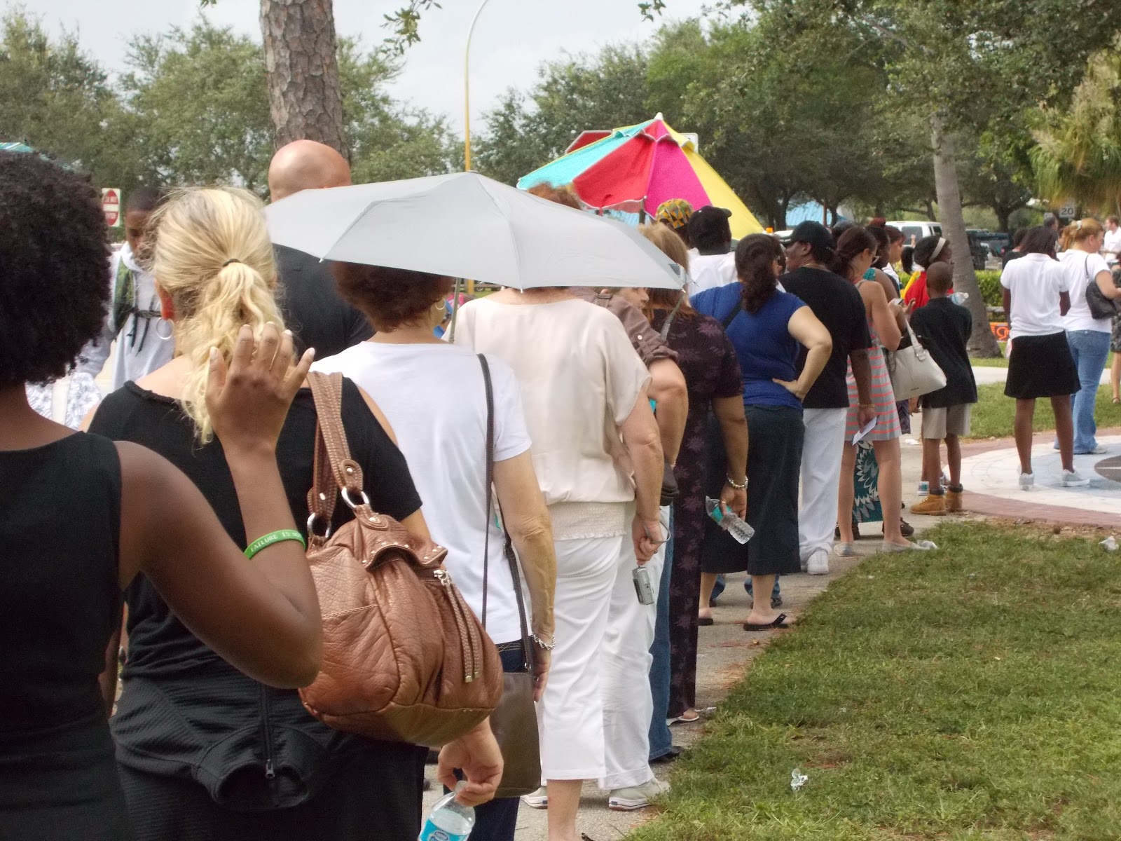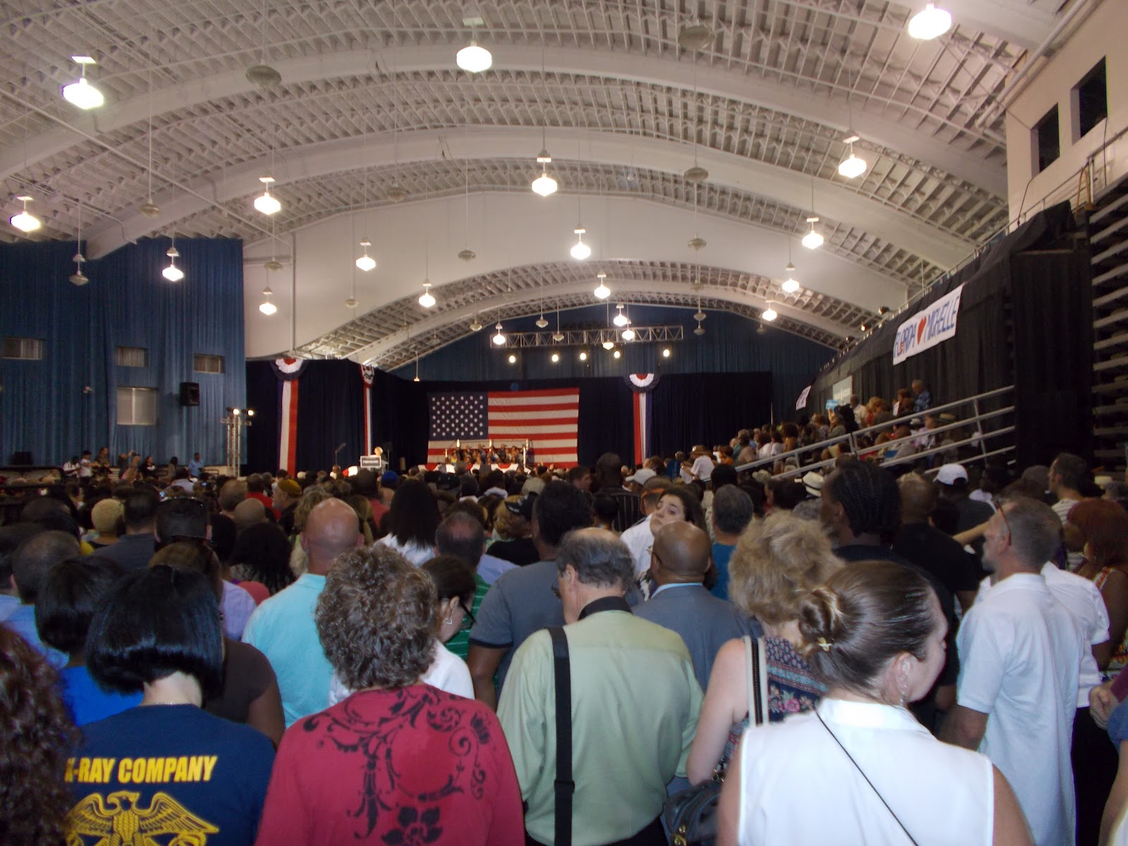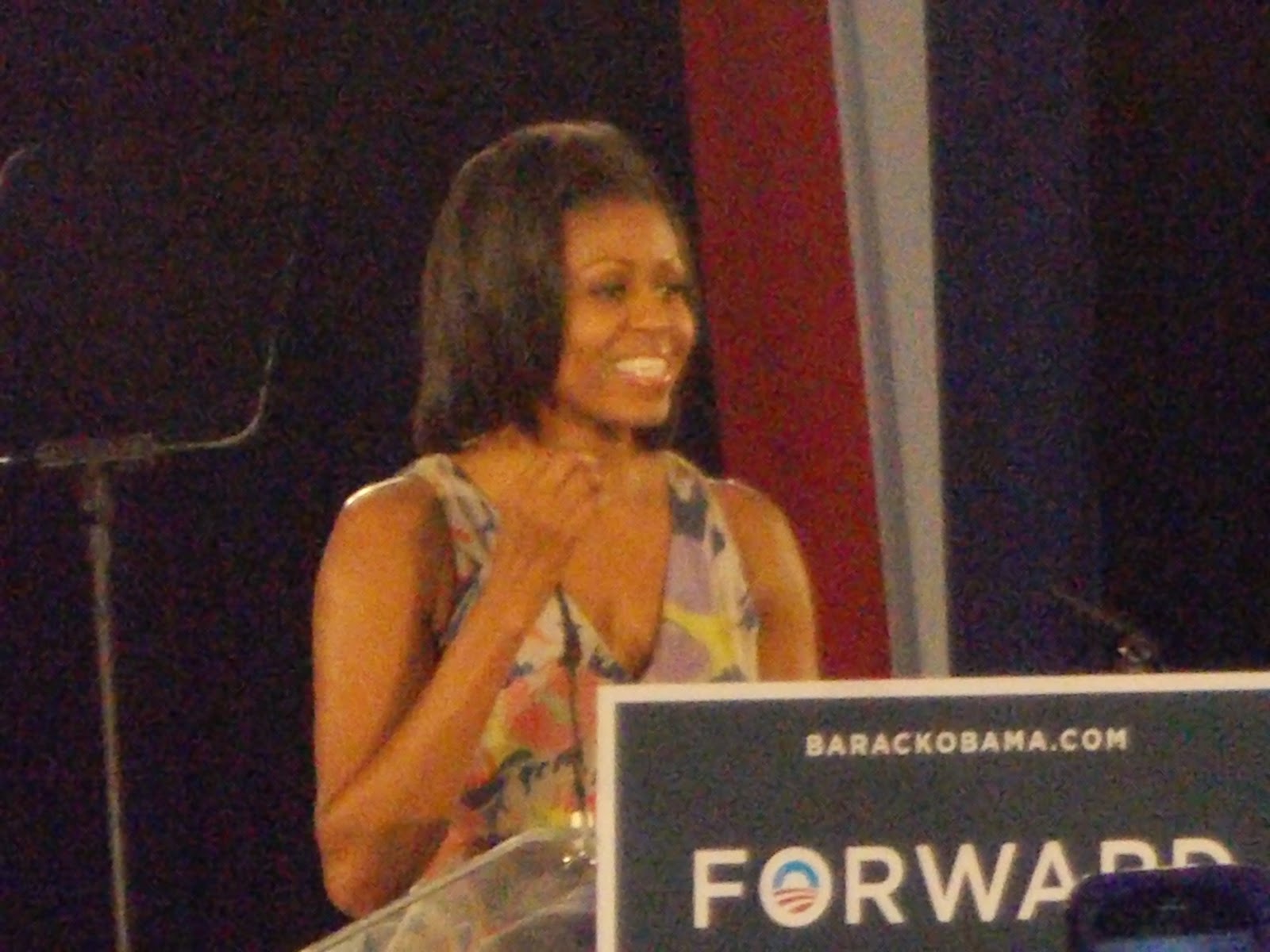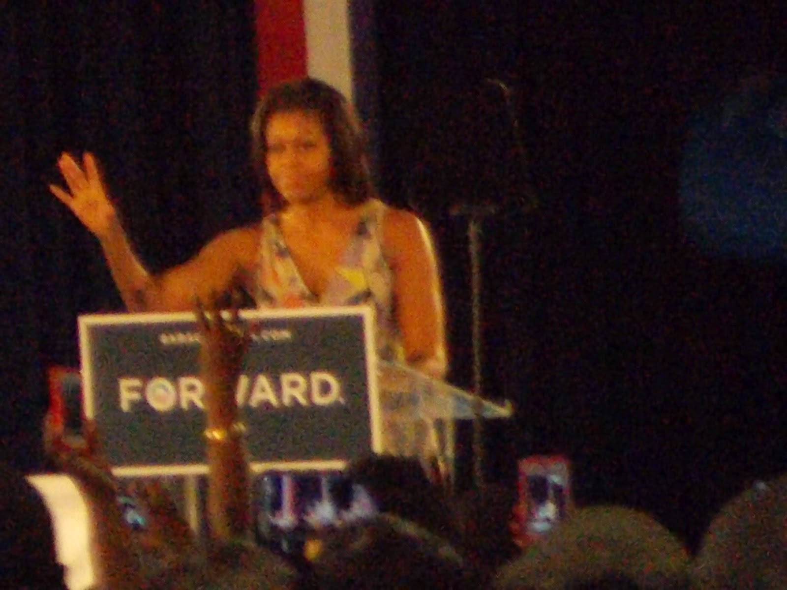 While we waited in line volunteers kept working the crowd, making sure everybody was registered to vote and to see who wanted to volunteer to help President Obama win the election. There was another group of volunteers who worked the crowd to alert us that we couldn’t bring in umbrellas, which many in the crowd carried to protect themselves from the oppressive sun, or cameras. This instruction puzzled a lot of people, who were all carrying cameras, and it had to be explained over and over again. The first explanation was that phone cameras were okay, but no other cameras. That also puzzled a lot of people, like myself, who were carrying stand-alone cameras. “Why are phone cameras allowed, but not other cameras?!?!” People were getting hot, and it wasn’t entirely from the heat. A lot of people had cameras and it’s only natural to want to document the day you saw the First Lady of the United States. It’s something you’ll want to show your children and grandchildren, provided the Mayans are wrong. Then it was clarified that small cameras, like mine, were allowed by not “big cameras.” However, the volunteers were unable to define “big camera” to anyone’s satisfaction. I presume they meant a 35mm camera with a telephoto lens, but who knows.