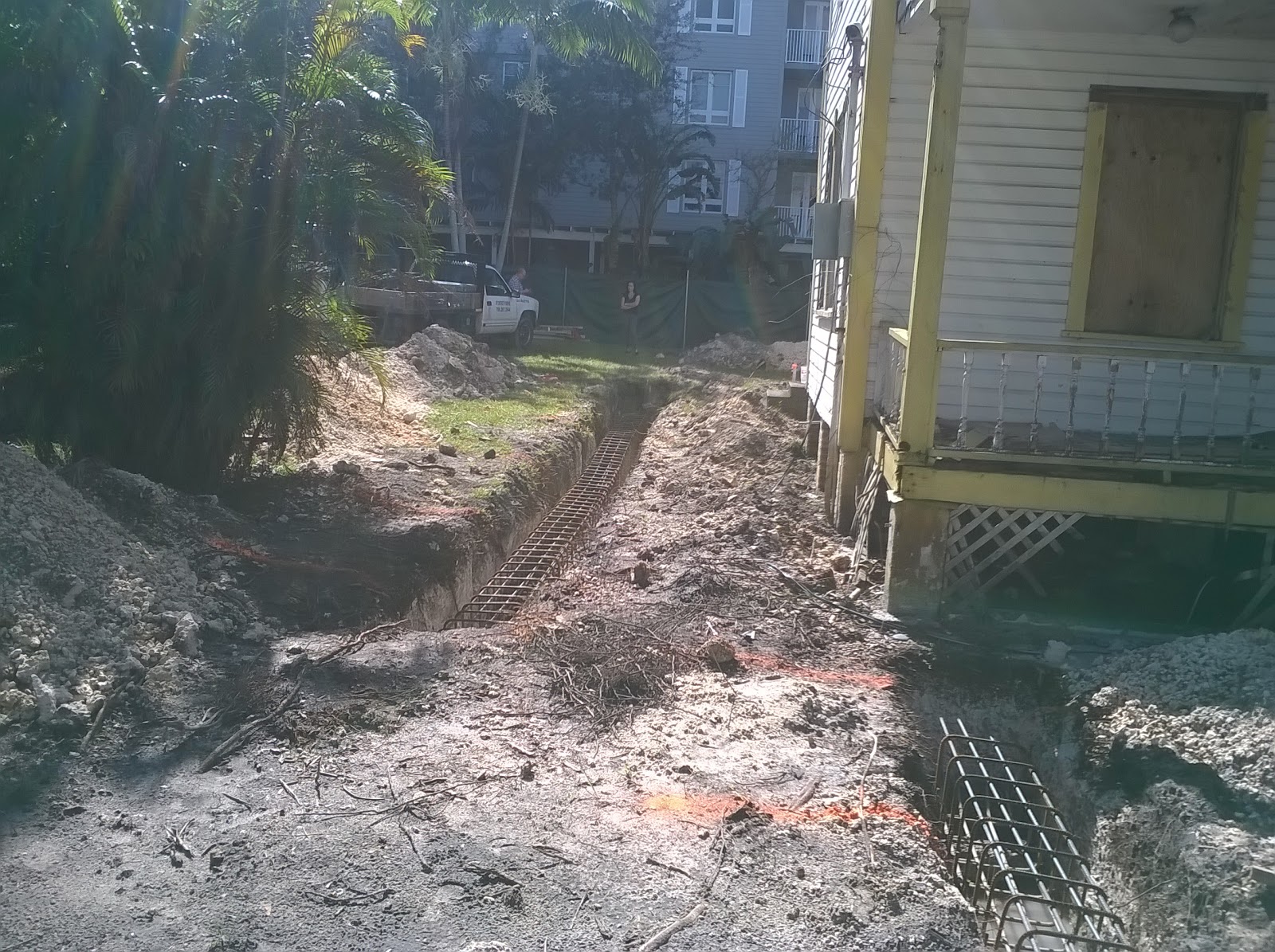 | The foundation trench has been dug, cemented, and the steel i-beams slung underneath the house, but before the house got jacked up. February 24, 2016 |
