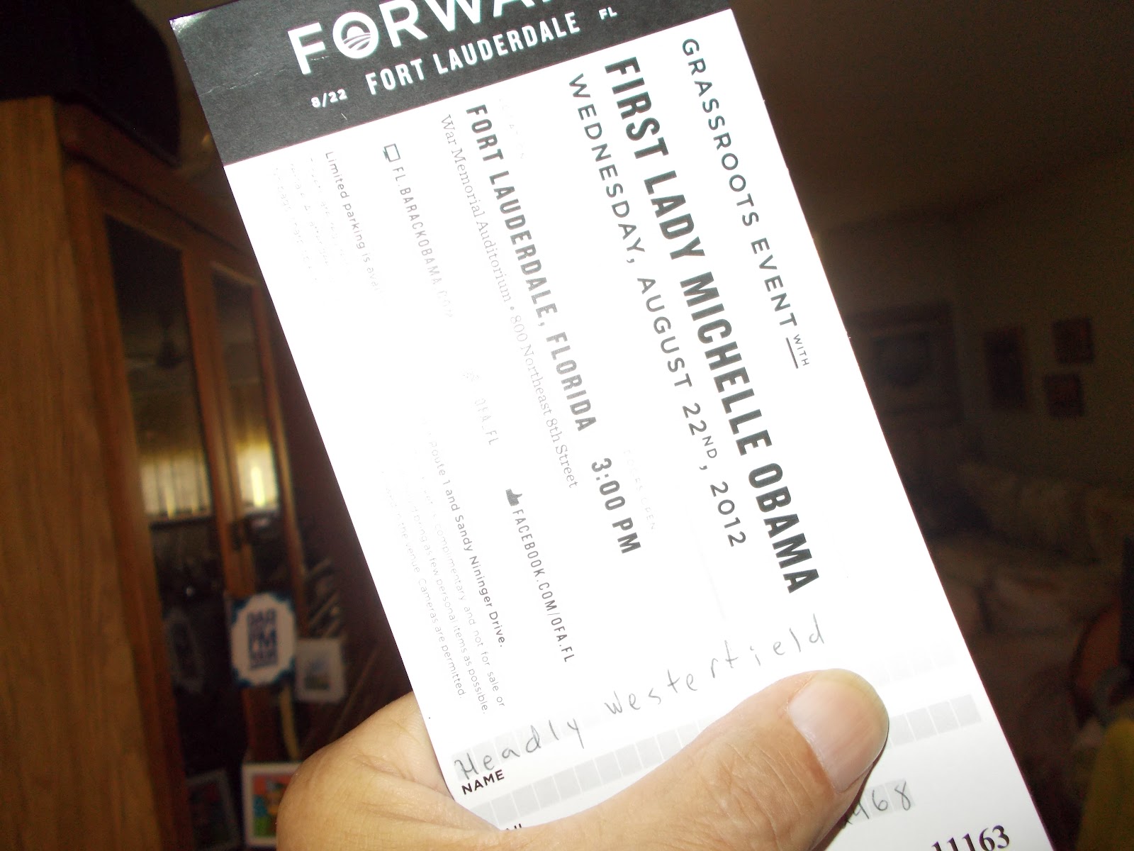 In the end no one asked anyone for a voter registration card once we were getting out ticket to see the First Lady, so all that anger and frustration in line seemed to be just for the fun and entertainment of the volunteers.