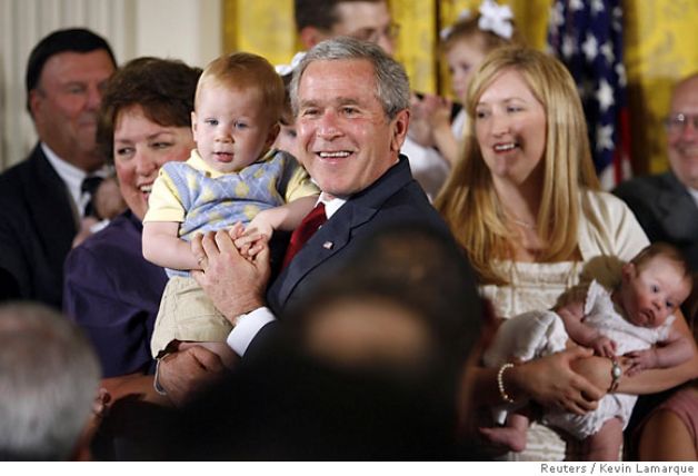 | Note how Dubya is actually using 1-year old Trey Jones as a human shield. That’s because Dubya was vetoing a bill which would have provided federal funds towards embryonic stem cell research. Dubya knew his decision was controversial and decided that using cute children as human shields might inoculate him from criticism. |