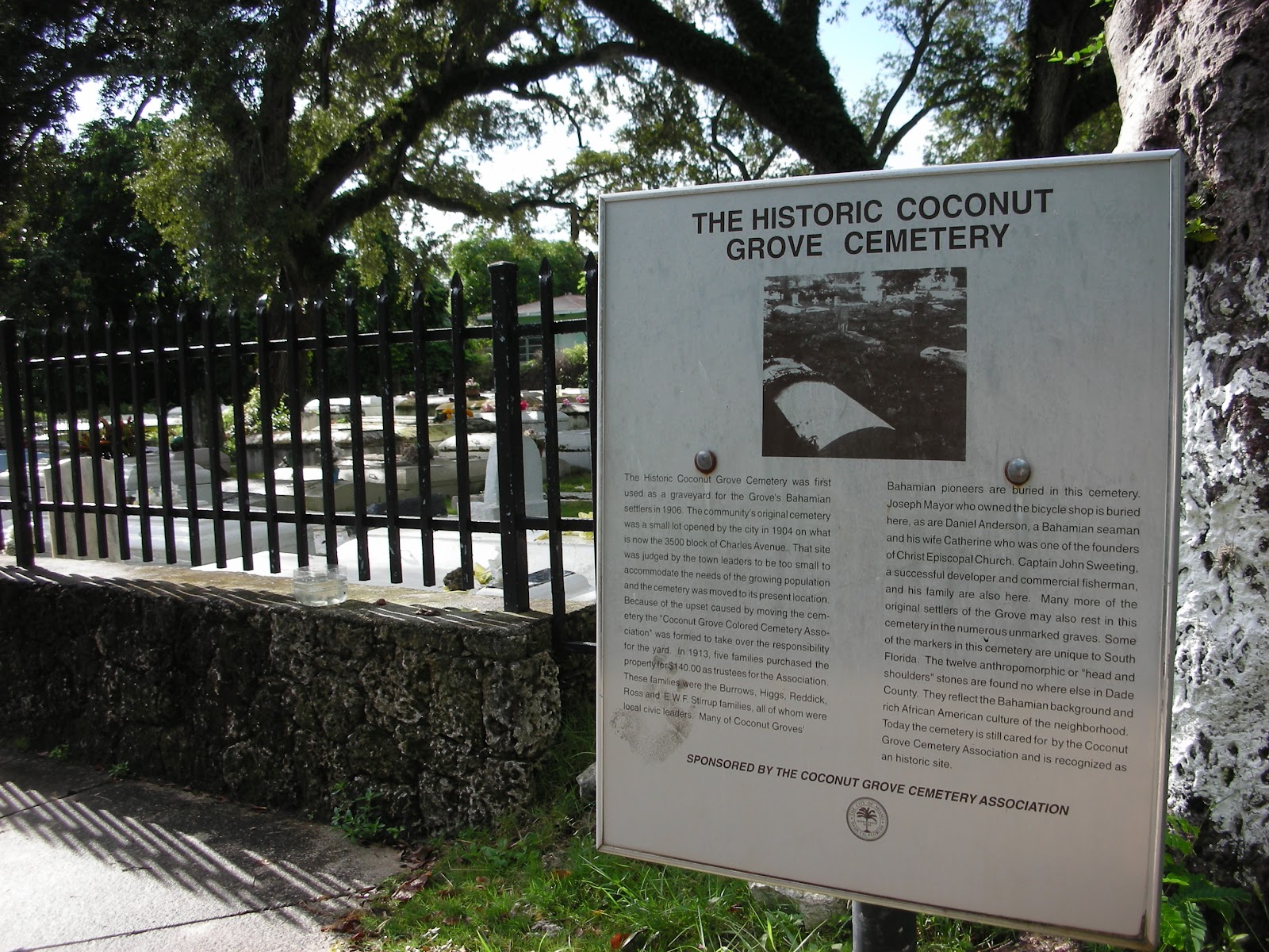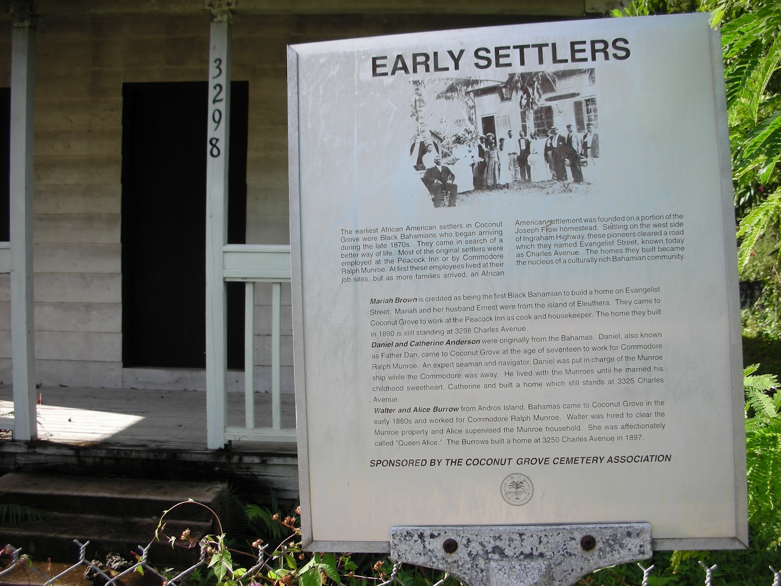 “The first black community on the South Florida mainland began here in the late 1880s, when Blacks primarily from the Bahamas came via Key West to work at the Peacock Inn. Their first hand experience with tropical plants and building materials proved invaluable to the development of Coconut Grove. Besides private homes the early buildings included the Odd Fellows Hall, which served as a community center and library, Macedonia Baptist Church, home of the oldest black congregation in the area, and the A.M.E. Methodist Church, which housed the community’s first school. At the western end of Charles Avenue is one of the area’s oldest cemeteries.”