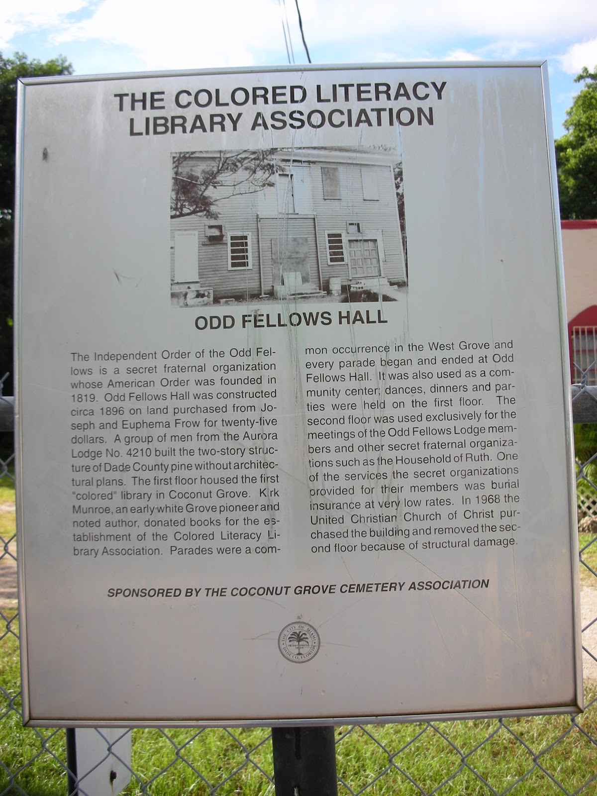 A few doors west of the E.W.F. Stirrup House is the current United Christian Church of Christ, aka Coconut Grove Seventh-day Adventist Church, which had once been the Odd Fellows Hall mentioned on the Charles Avenue historical marker. A sign in from of the building, erected by the Coconut Grove Cemetery Association, tells of the history of the Odd Fellows Hall and its importance to the early settlers of Coconut Grove.