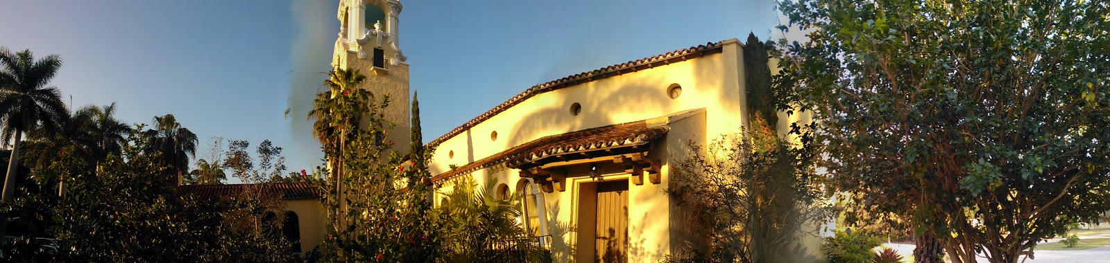| Panorama of the western facade of only the front section of the Coral Gables Congregational Church. |
