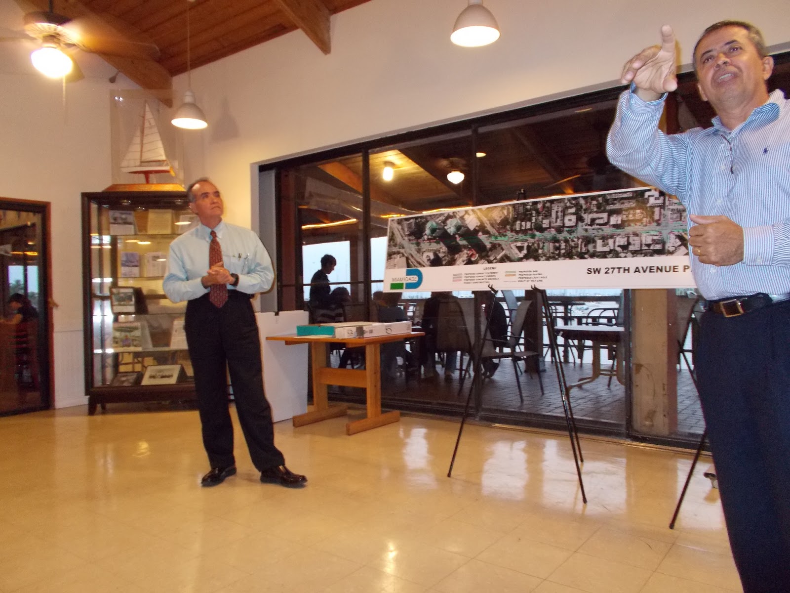 There were almost as many people on the executive council as observers in the room. The residents were getting an update from the City of Miami on the redesign of SW 27th Avenue, including its new, radical, peanut-shaped traffic calming circle at Tigertail Avenue. There were questions from the councilors about how traffic circles work (Really?) and questions from the residents about tree remediation. Yawn.